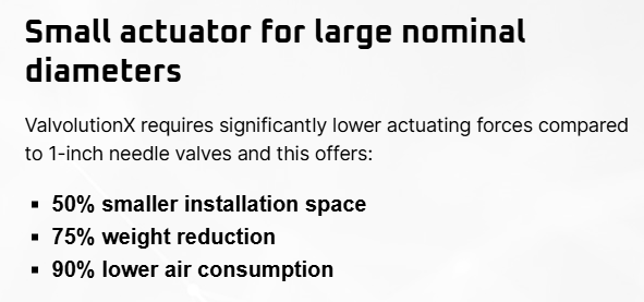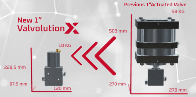 Compared to conventional high-pressure needle valves with compressed air actuators, ValvolutionX breaks new ground with 50% space reduction, 60% service time reduction and 75% weight reduction.